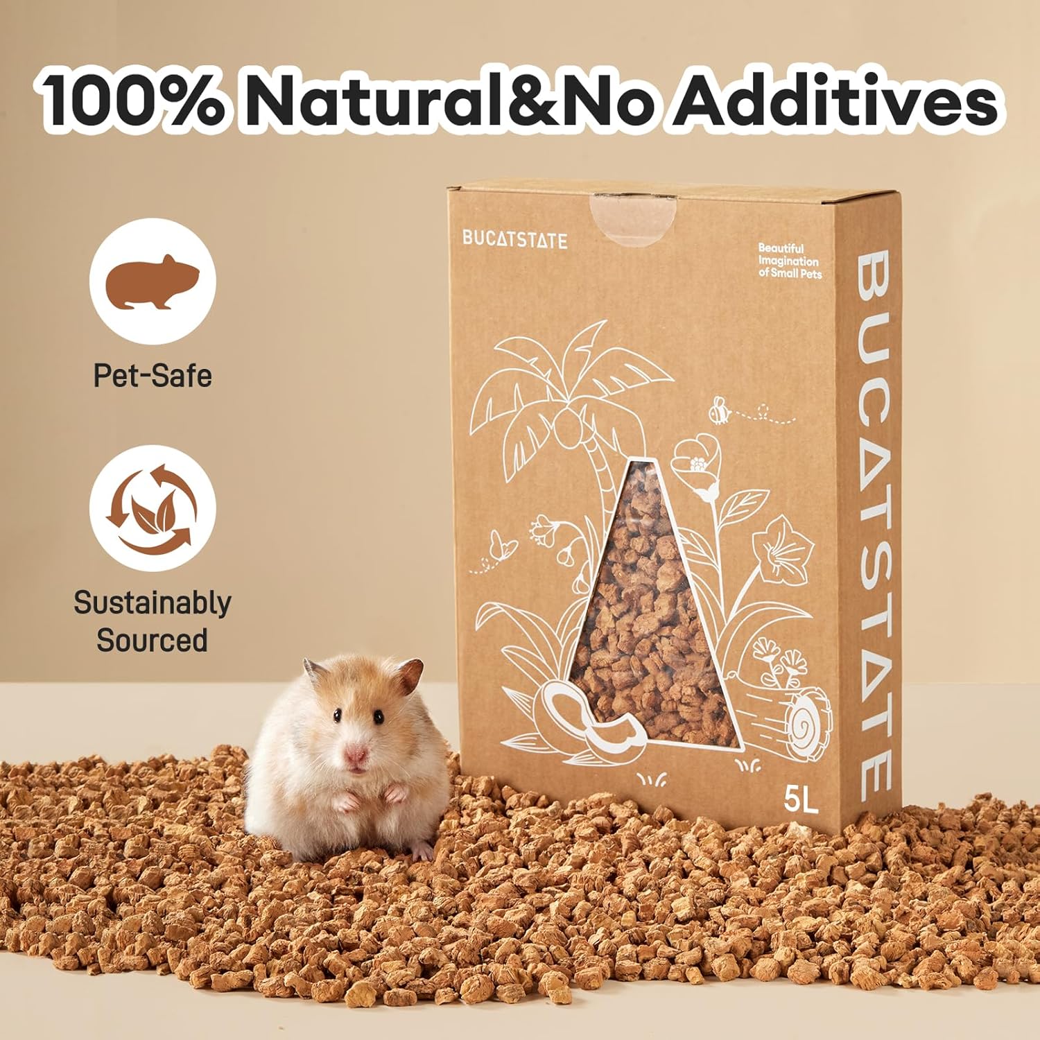 BUCATSTATE Cork Bedding 5L, Natural Hamster Bedding Odor Control for Dwarf Syrian Hamsters, Gerbils, Mice, Low-dust Hamster Substrate with Paper Hideout Box (Grain 4-5mm)