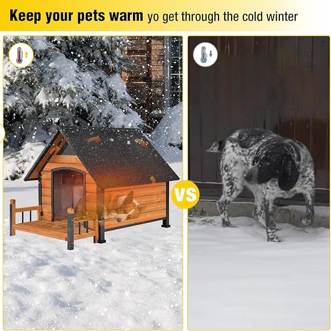 - Spacious and Comfortable:With dimensions of 37.4" L x 36.6" W x 37.2" H, this large dog house provides ample space for your pet to move around comfortably. The elevated wooden platform helps keep your pet off the cold ground, while the front porch adds extra space for relaxation