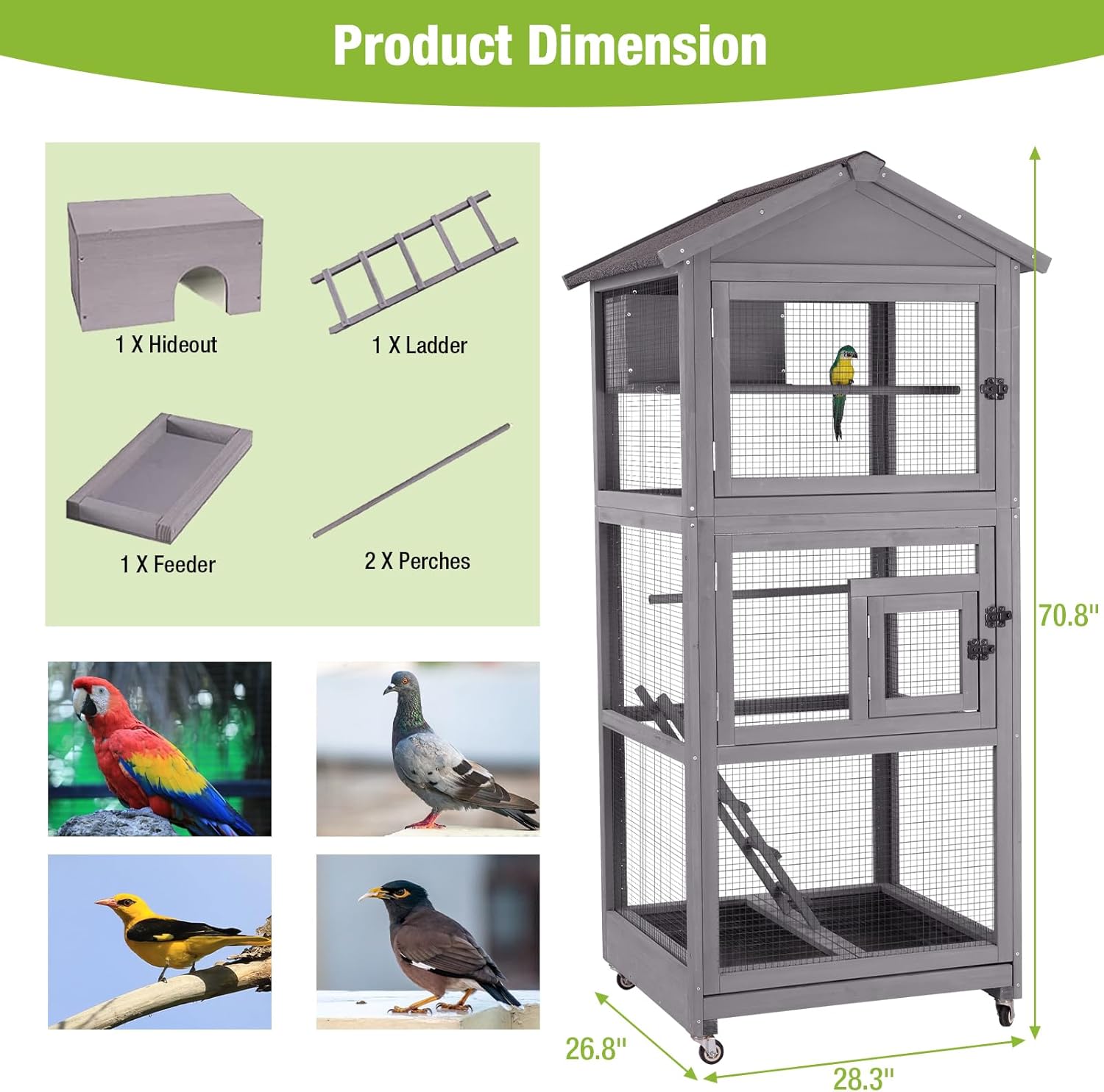 GUTINNEEN Large Bird Cage Outdoor Wooden Aviary Indoor on Wheels, with Play Stand, Perches, Nest Habitat & Wire Mesh Tray for Easy Cleaning