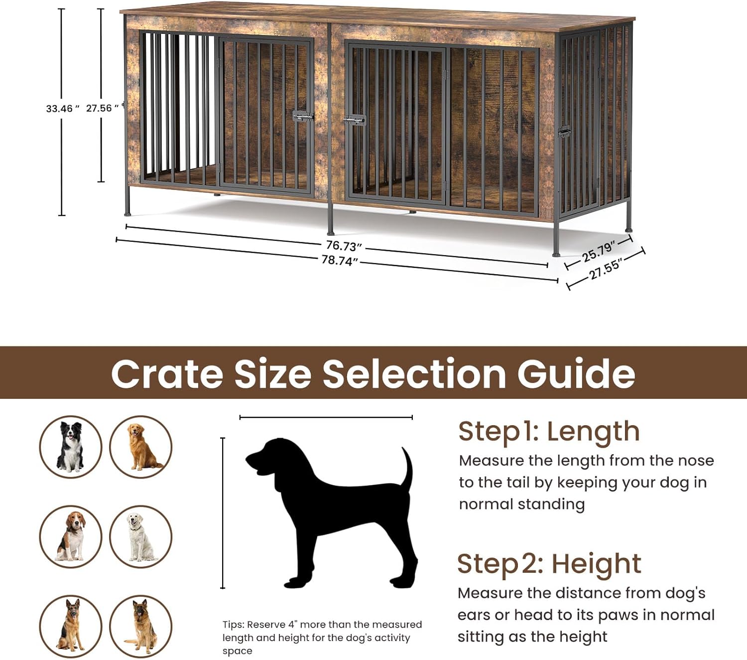 - Furniture-Style Dog Crate Table: The long rustic wood top turns the unit into a 78-inch console or TV stand that holds lamps, plants, books and more. It blends with modern, farmhouse or industrial décor, saving floor space by combining storage and a stylish dog cage furniture piece.