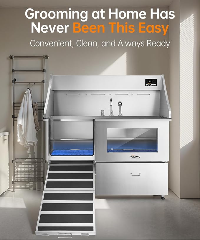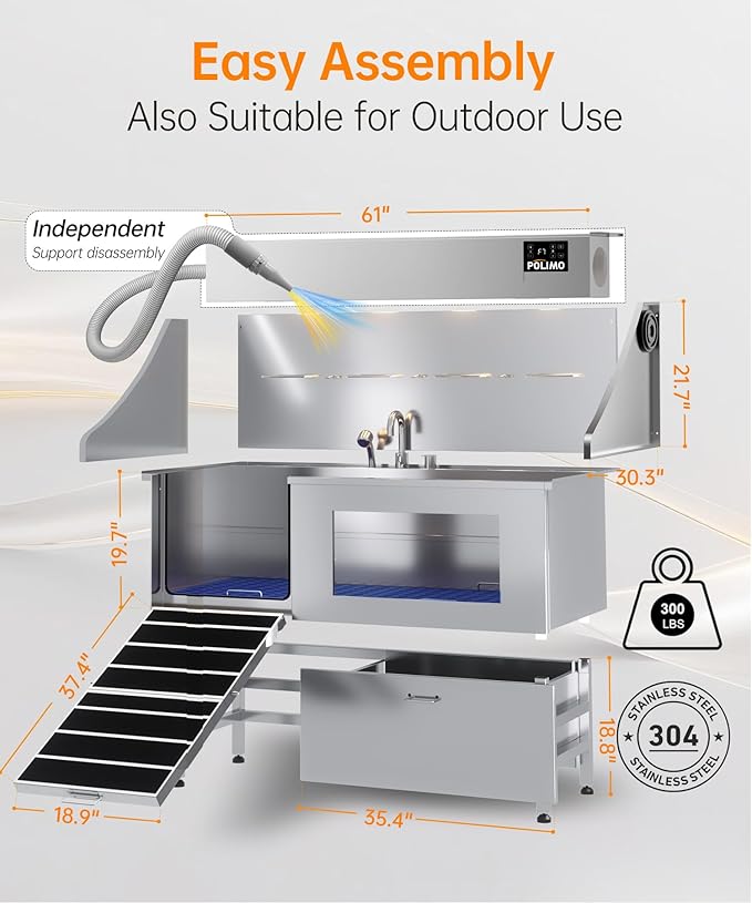- Premium Stainless Steel Build & Smart Design : Crafted from rust-resistant 304 stainless steel with a full-welded, leak-proof structure, this dog tub is built to last. It features a Grade-A tempered glass viewing window (Eases pet anxiety); A foldable ramp (For easy access, especially for senior dogs); A removable two-piece floor grate (3 height adjustments for large, medium, and small dogs); And a sliding storage drawer (Keeps grooming tools organized). Every detail is designed for a more professional, comfortable, and efficient dog shower tub experience