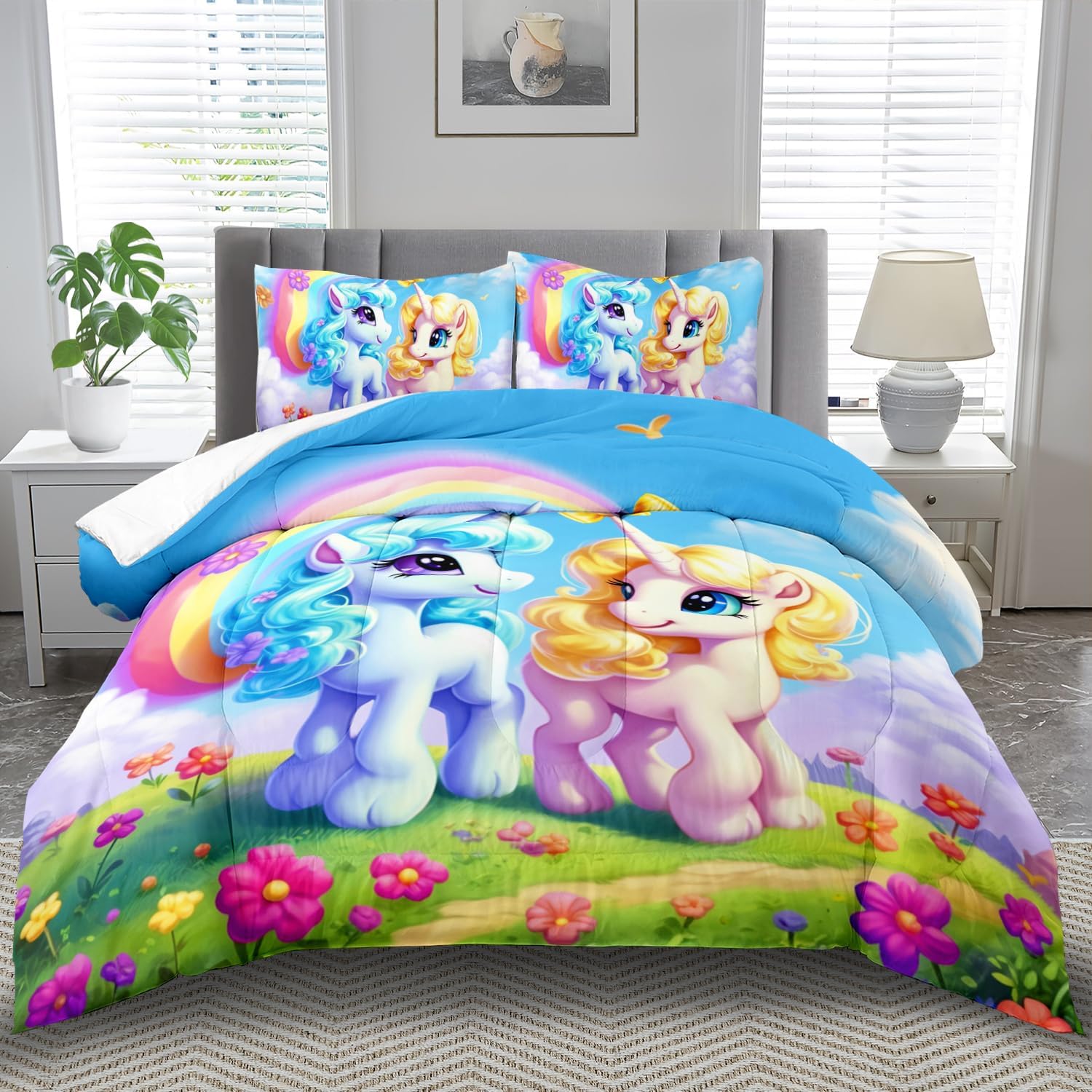 - Full Size Rainbow Unicorn Comforter Set :This bedding set includes 1 comforter(67" x 85") and 2 pillowcases(20”x30”). In order to facilitate transportation, the quilt is made of vacuum compression technology. It will be slightly wrinkled when taken apart, but it will quickly regain its fluffiness if you gently beat it.