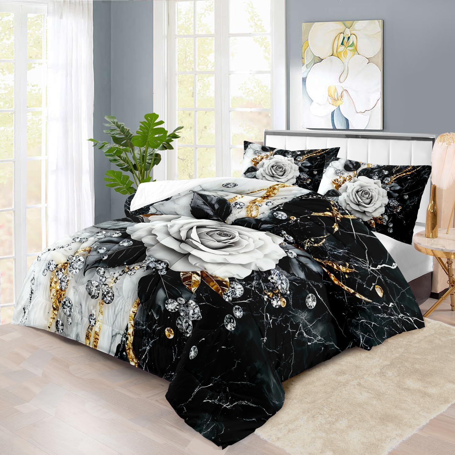 Marble Floral Comforter Set for Full Bed Women,Vintage Flower Bedding Set Full,White and Black Comforter Rose Quilt for Girls,Rose Bedding Floral Bedroom Decor Adults