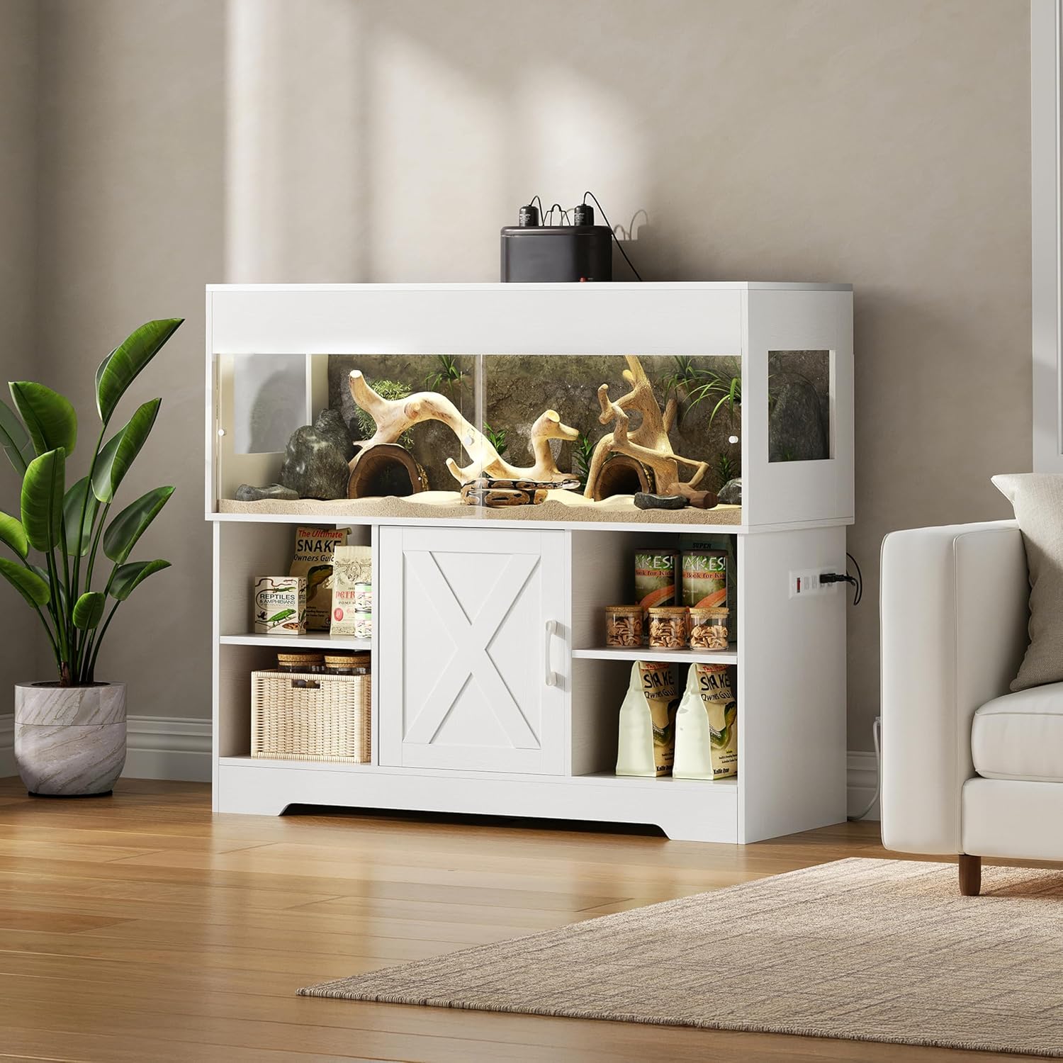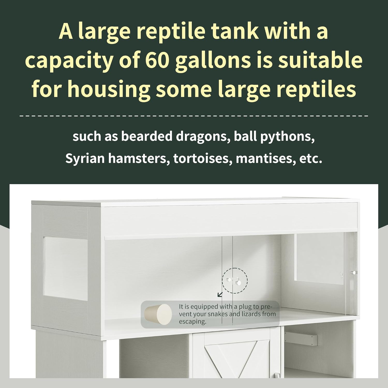 - All-in-One Storage Base – More than just a vivarium tank, this design includes a full base cabinet with dual side compartments and a center door cabinet. Easily store all your reptile care essentials—UVB lamps, heating mats, thermometers, substrate, snacks, and tools—in one organized space.