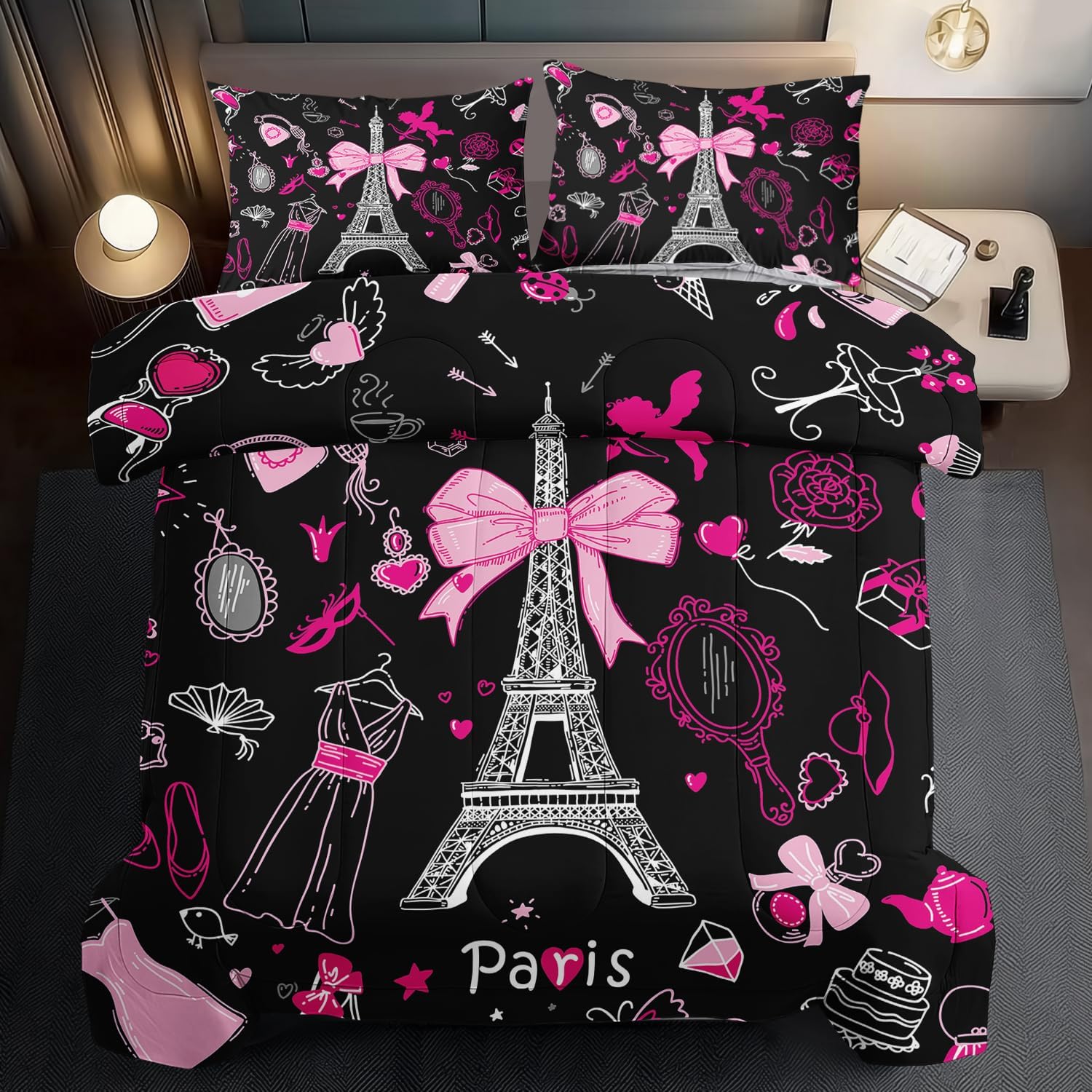 Eiffel Tower Comforter Set King Size,Eiffel Tower Bedding Set for Girls, Pink and Black Paris Themed Comforter Bedroom Decor,Paris Quilt French Style Romantic Bedding