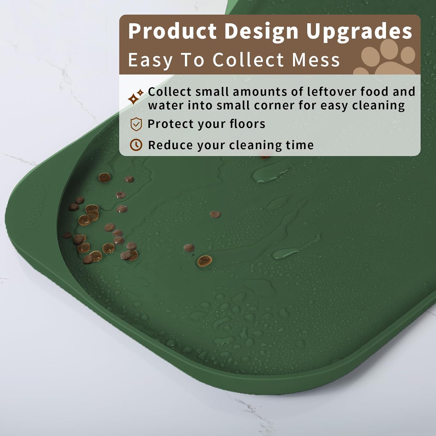 Silicone Pet Feeding Mat with Raised Edge & Residue Collection Pocket for Food and Water, Dog Bowl Mats, Cat Bowls Placemat with High Lip for Floor Waterproof, 19 x 12 x 0.7 Dark Olive