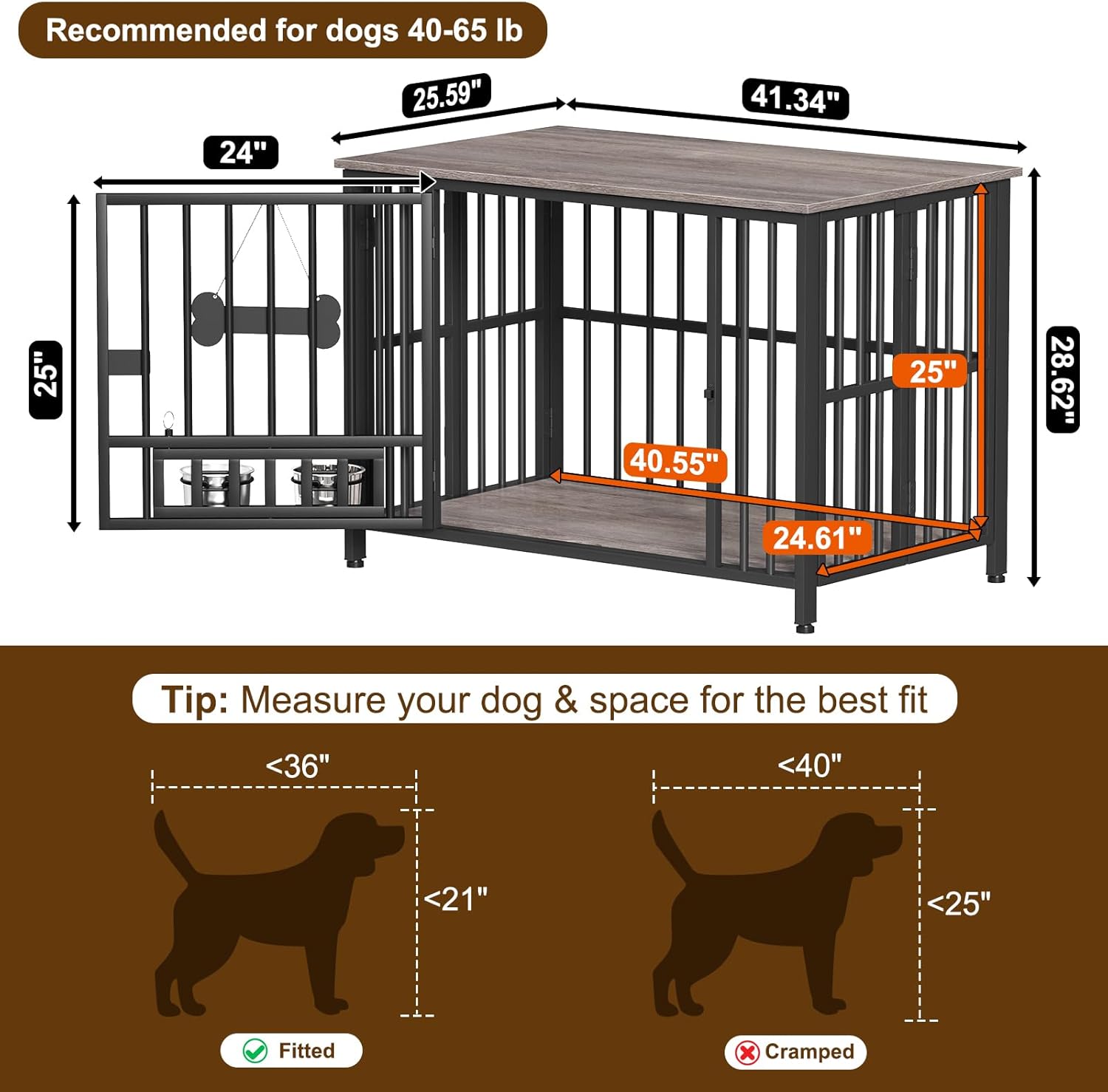 Easycom 41" Dog Crate Furniture Foldable, No Assembly Decorative Dog Kennel Indoor, Dog Crates for Large Dogs (40-65 lbs), Wooden Dog Cage with Adjustable Bowls and Name Tag, End Table, Oak Grey