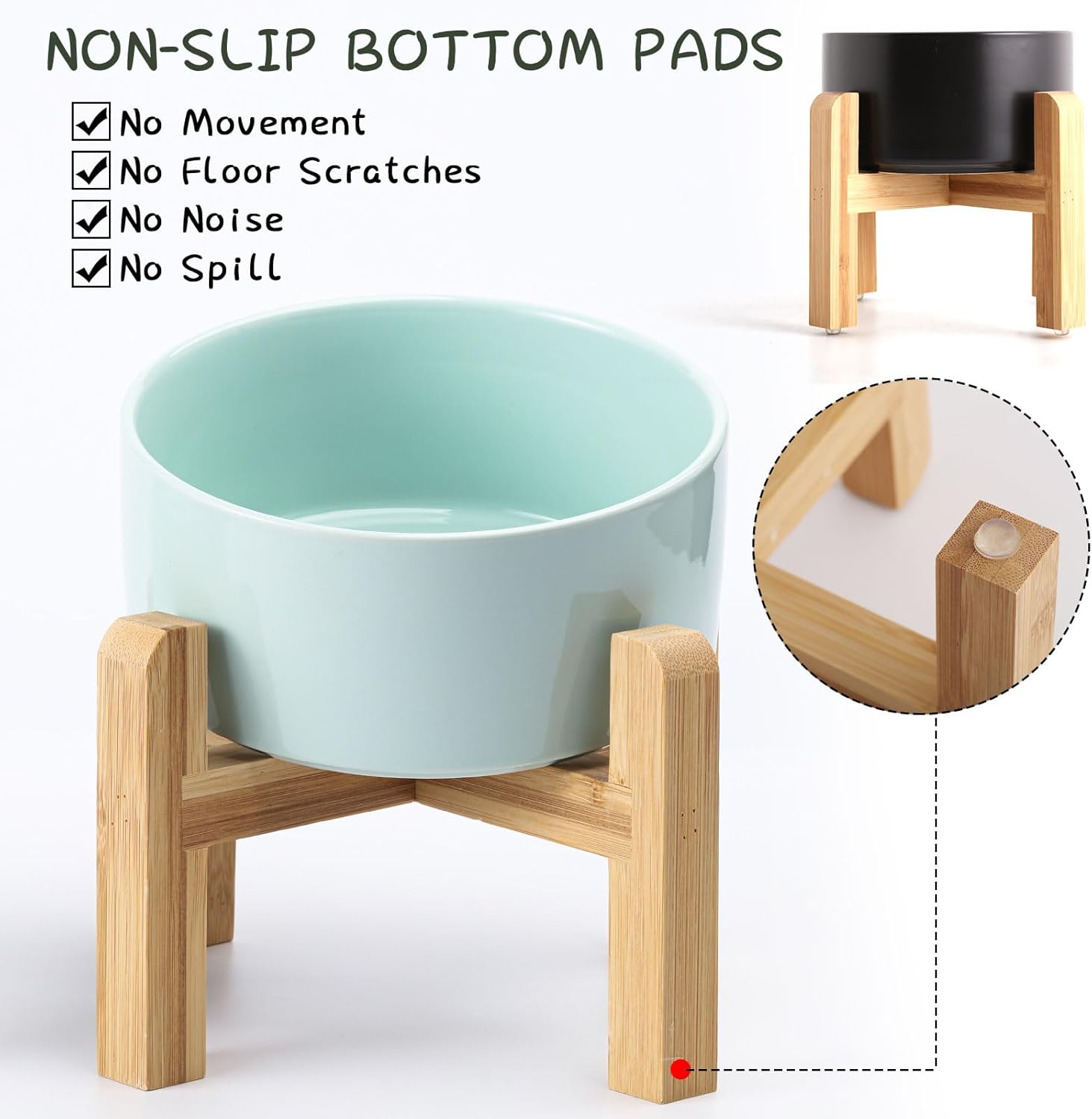 - NON SLIP WOOD STAND -You can get two different heights by flipping the bamboo stand,the elevated medium size ceramic pet bowls are perfect for small and medium dogs from different stages of childhood to adulthood, The wood stand on the bowls stopping ceramic dog bowl from sliding around, Keeps pet food and water in the bowls.