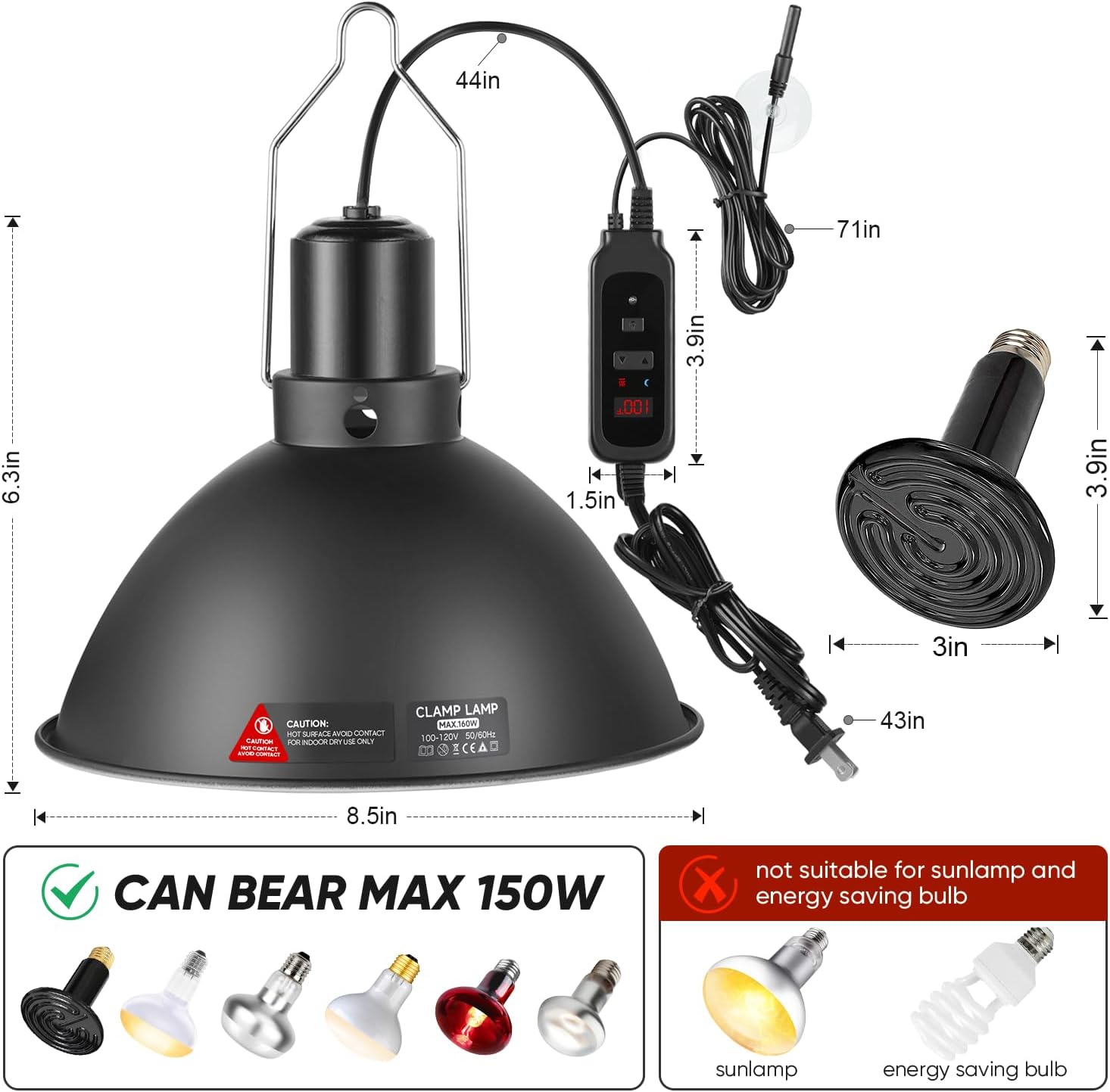 DXOPHIEX 8.5inch Reptile Heat Lamp with Thermostat, Reptile Light Fixture with Dimming Thermostat, Deep Dome Lamp Fixture with 150W Ceramic Heat Emitter for Bearded Dragon, Turtles, Snake and Lizard