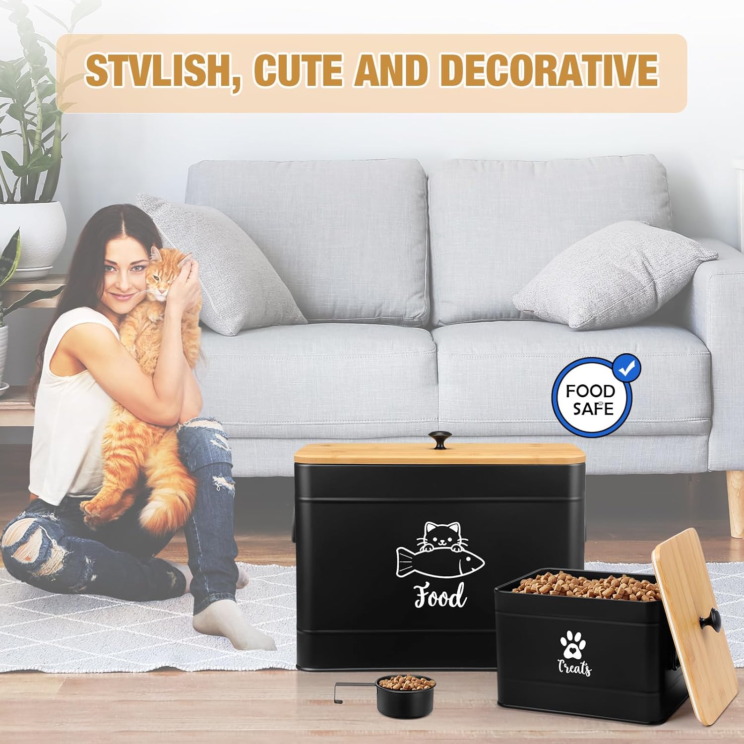 Extra Large Metal Cat Food Containers Airtight 12+3.5 lbs Cat Treat Snack Jars Set of 2 with Bamboo Lids and Spoons Farmhouse Big Pet Cookie Storage Jars for Kitchen Counter Gifts(Black)