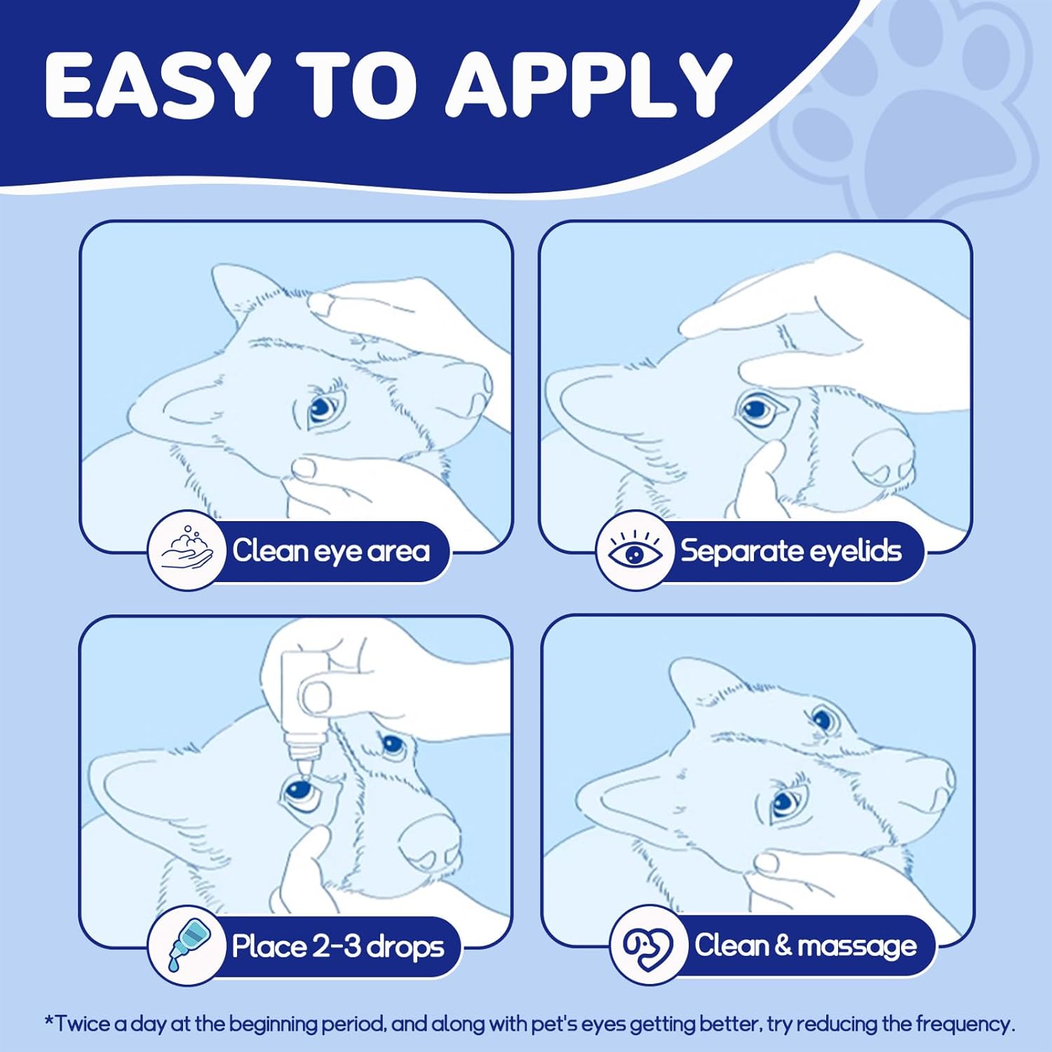 - Easy Application: Dropper tip design ensures precise and easy dispensing of each drop while protecting your pet's eyes from accidental injury. Gently lift dog's head, take 2-3 drops to the dog's eyes twice a day. Small enough to stash anywhere—care for your pet’s eyes stress-free at home, on walks, or while traveling