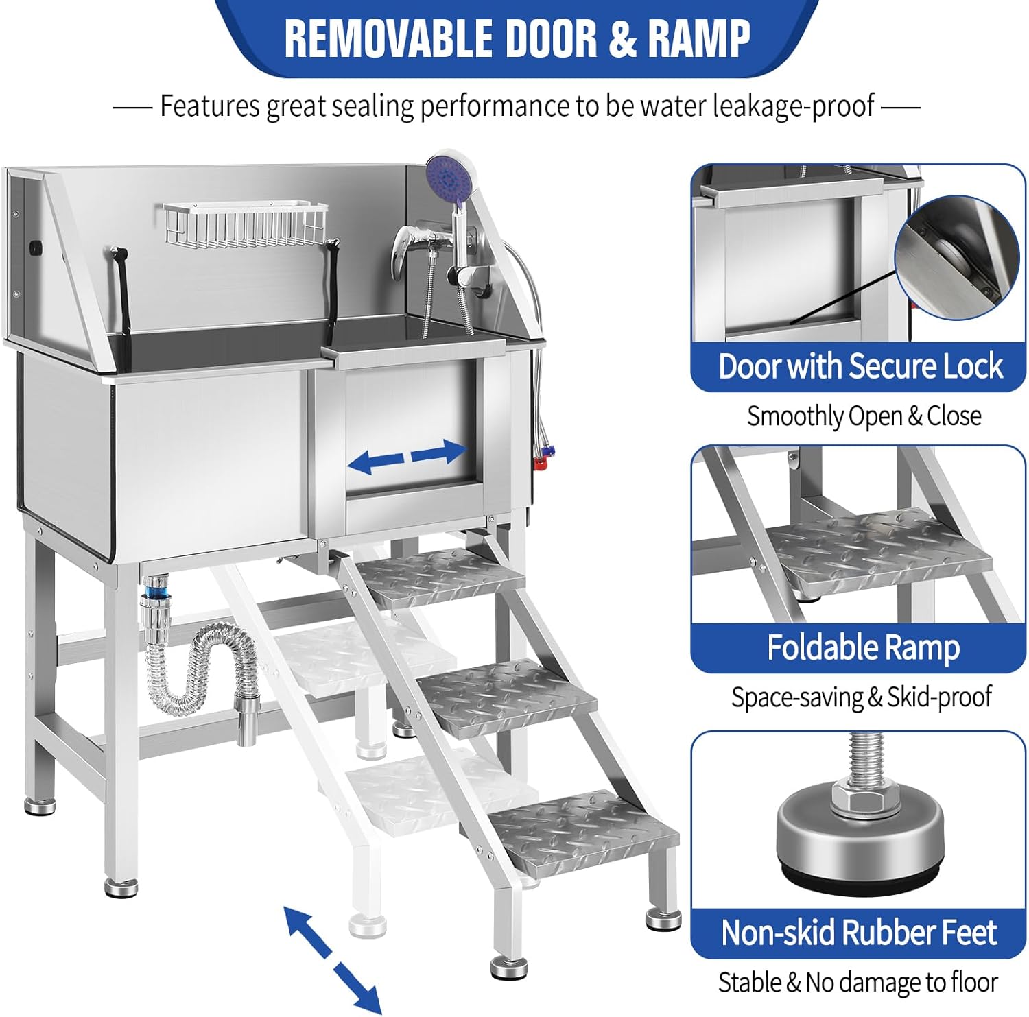 • 1. Premium Stainless Steel Construction: Crafted from high-quality 304 stainless steel, this dog wash station is rust-proof, durable, and built to last. The advanced design features a perfect drainage system for stability, making pet cleaning effortless and efficient.