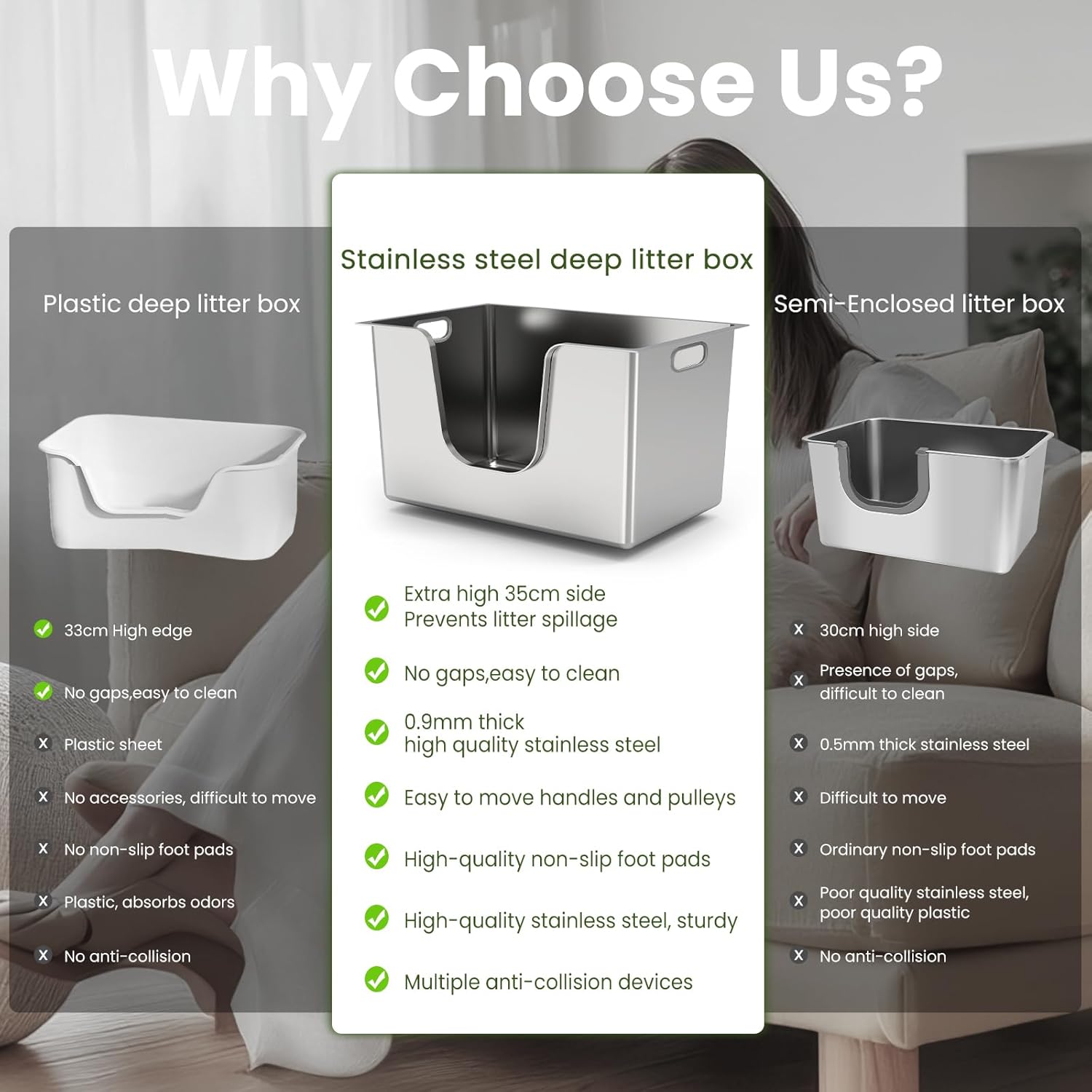 - Odor-Free & Easy to Clean: Crafted from high-quality stainless steel, this open cat litter box won't absorb odors. Durable metal material resists dents, scratches, and abrasions, ensuring long life and easy cleaning. Unlike plastic trays, a stainless litter box is rust-proof and non-stick, helping to maintain a fresh, sanitary environment for you and your pet.
