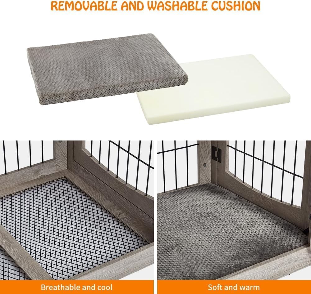 - 🐕【Sturdy and Bite-Resistant】This wooden dog crate furniture is made with high-quality wood and 5mm steel fencing. The sturdy wood and iron construction enhances bite resistance, providing comfort, durability, and easy maintenance. It also features a door stop for added security, preventing your dog from escaping. The wooden base provides stable support and protects your dog's feet from injury.