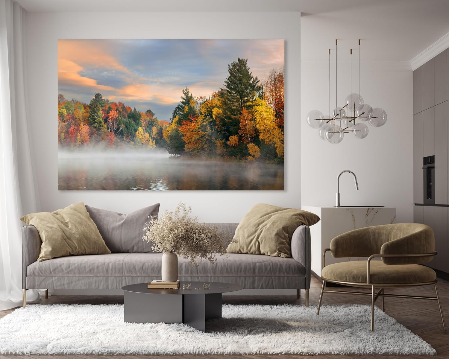 Nature Wall Art Prints - Ocean Forest Mountain Lake Canvas Landscapes - Small to Extra Large Living Room Bedroom Kitchen Bathroom Décor (Misty Fall Reflection, 35L" x 53W")