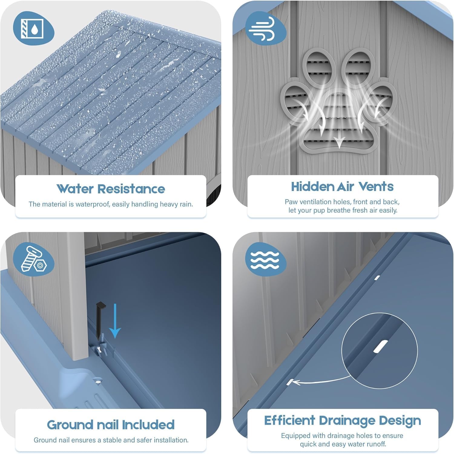 - 🐾【Durable & Weatherproof】: Crafted from high-quality PP (polypropylene) material, this dog house is waterproof, Whether it’s rain, sun, or snow, your dog will stay dry and comfortable year-round. This doghouse is equipped with ground nail that ensures it stands up to strong wind conditions.
