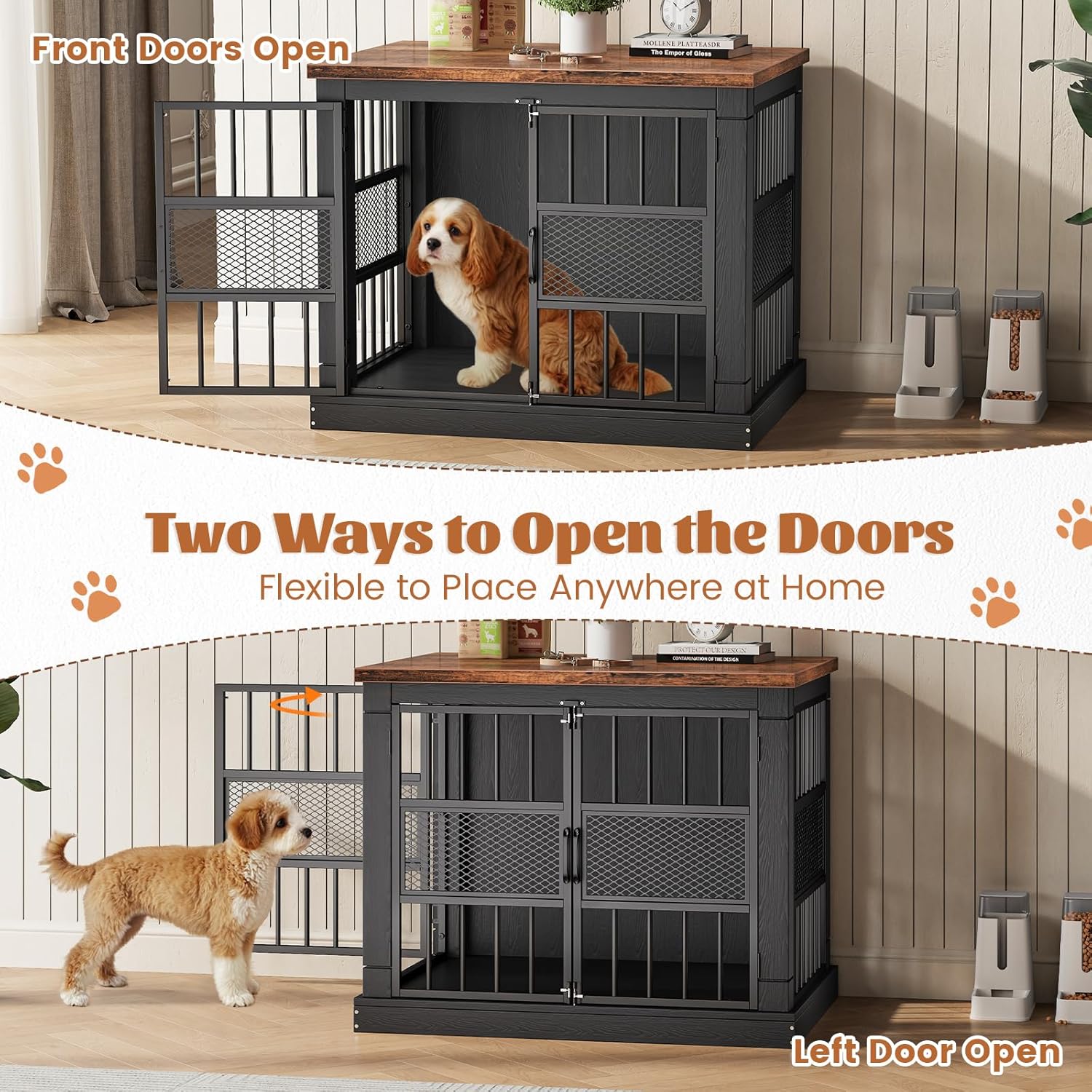 - Flexible Placement: Designed with both a left-side door and a front door, this dog kennel indoor allows easy entry and exit for your pet. The versatile design of the dog crate lets you place it anywhere in your home without inconvenience